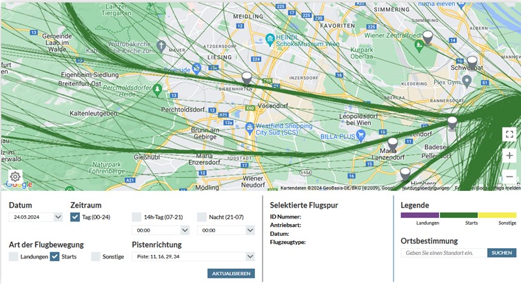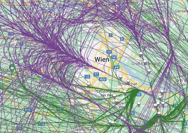Ihr könnt die Flugspuren über Wien und rund um den Flughafen Wien-Schwechat mit einer Stunde Zeitverzögerung verfolgen.